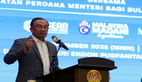 Datuk Seri Anwar Ibrahim berucap pada Perhimpunan Bulanan Bersama Warga Kerja Jabatan Perdana Menteri (JPM) bagi Bulan Sept 2025 di Dewan De 'Seri Endon Puspanitapuri hari ini / BERNAMA