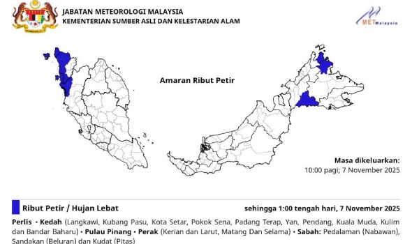 KUALA LUMPUR,7 November-Jabatan Meteorologi Malaysia (MetMalaysia) hari ini mengeluarkan amaran ribut petir,hujan lebat dan angin kencang yang dijangka melanda beberapa negeri di bahagian utara serta sebahagian kawasan di Sabah sehingga pukul 1.00 tengah hari ini.