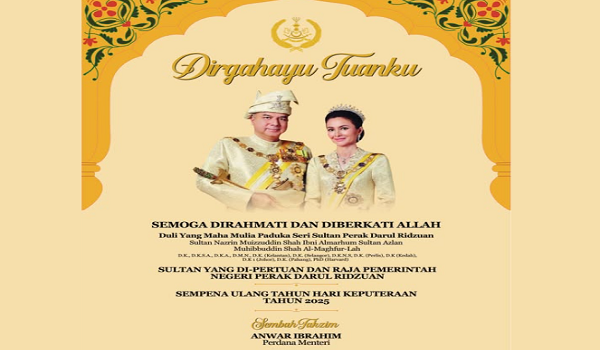 “Merafak Sembah dan setinggi-tinggi tahniah sempena Sambutan Ulang Tahun Hari Keputeraan Duli Yang Maha Mulia Paduka Seri Sultan Perak Darul Ridzuan,Sultan Nazrin Muizzuddin Shah ibni Almarhum Sultan Azlan Muhibbuddin Shah Al-Maghfur-Lah.
