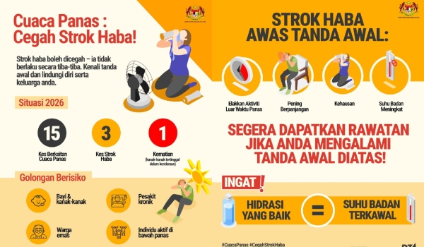 PUTRAJAYA,23 Mac – Sebanyak 15 kes berkaitan cuaca panas dilaporkan setakat ini bagi 2026,termasuk tiga kes strok haba dan satu kes kematian melibatkan seorang kanak-kanak yang tertinggal dalam kenderaan,kata Menteri Kesihatan Datuk Seri Dr Dzulkefly Ahmad.